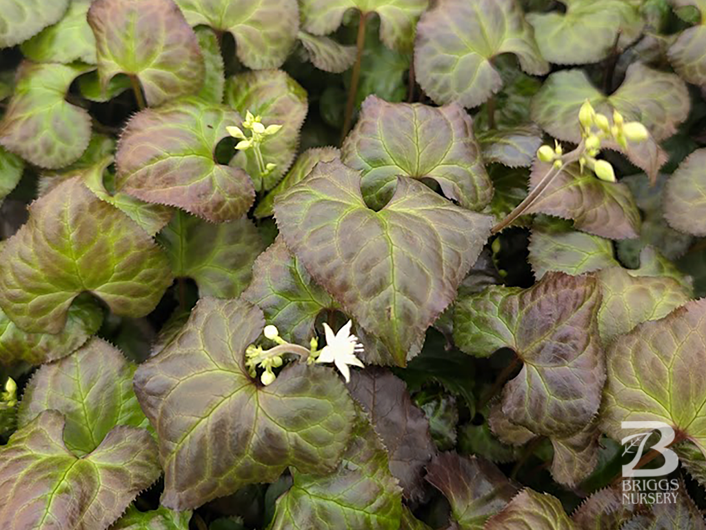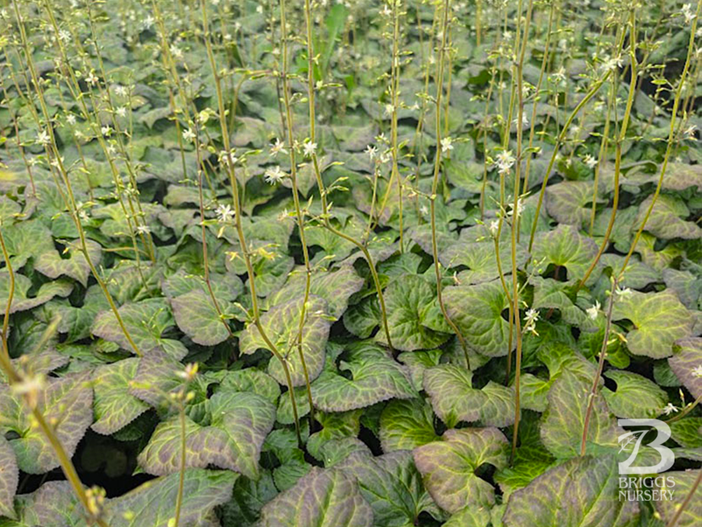Very cute, glossy, evergreen heart-shaped leaved groundcover, tinged in purple hues, forms dense rosettes up to twelve inches across. The white flowers rise up above the foliage in mid to late spring. Excellent in well-drained yet moist soil in full or partial shade. 1′ x 1′