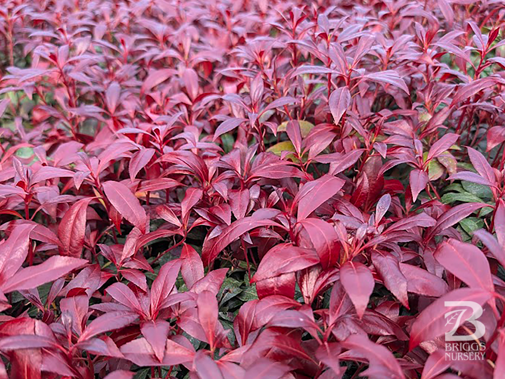 Katsura’ has bright, glossy leaves with deep wine-red new growth changing to green with age. In late spring, white blooms cascade over green foliage, and new growth comes in glossy red again. Lilac white flowers are born on rose-colored racemes. 6′ x 6′