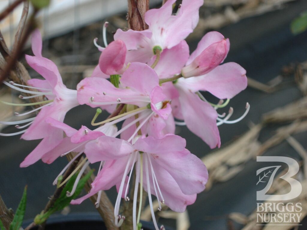 Deciduous, two-lipped flowers appear before foliage in white to rose pink or deep pink & spotted orange red. Grows to 5′ in 10 yrs.