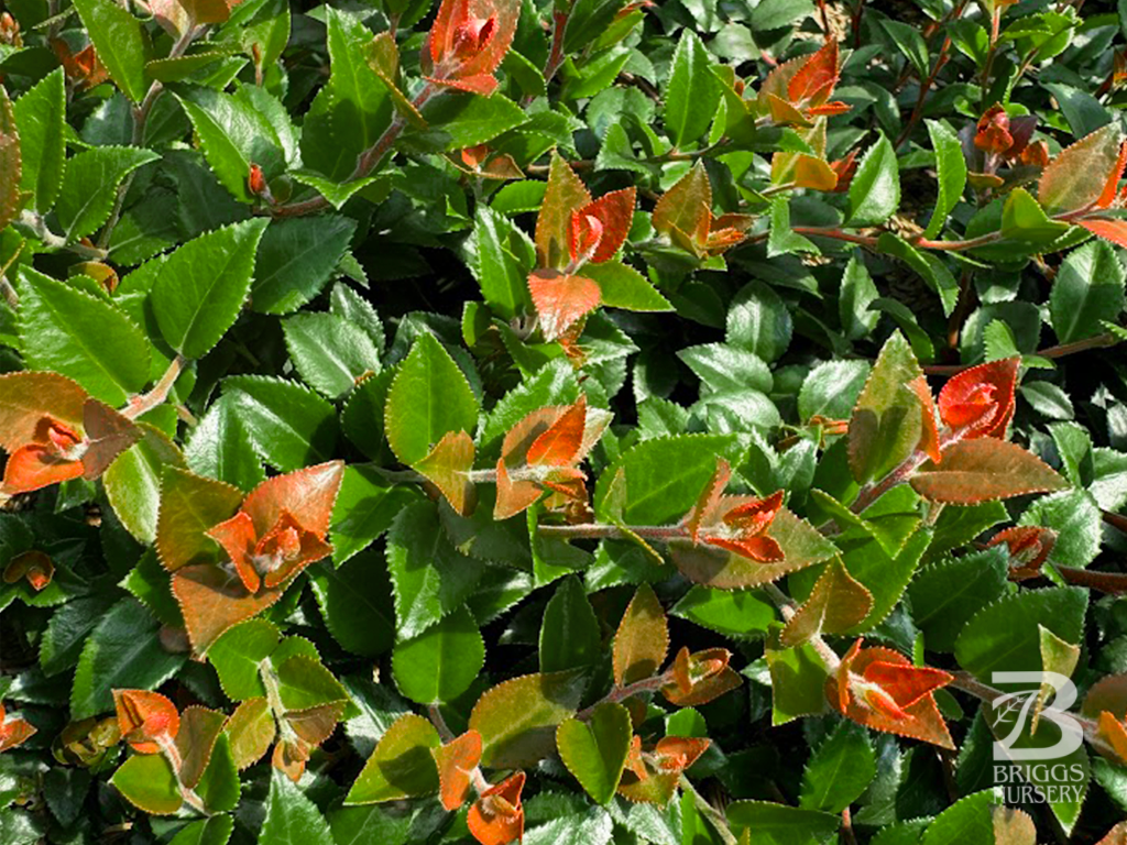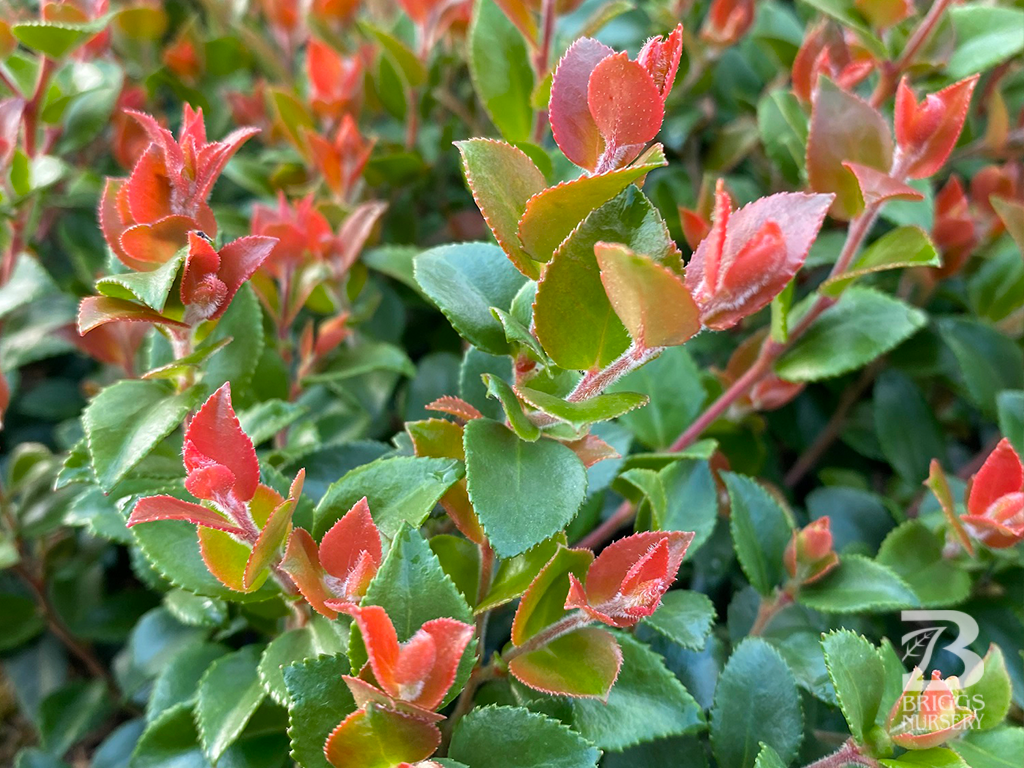 Developed at the Oregon Agricultural Research Center in Corvallis, Oregon and introduced by Oregon State University. Vaccinum ovatum ‘Cascade Jewel’ stands out from other cultivars with thicker more rigid stems, giving ‘Cascade Jewel’ a more structured upright habit. Dense compact growth allows for a less floppy evergreen shrub while maintaining vigorous growth habits which allows for a quicker finish with less pruning. Eye catching new deep red growth. Extremely floriferous, providing racemes of white, urn shaped flowers that bloom in the spring followed by medium to large glossy purple/black berries in the summer. Multiple points of interest.